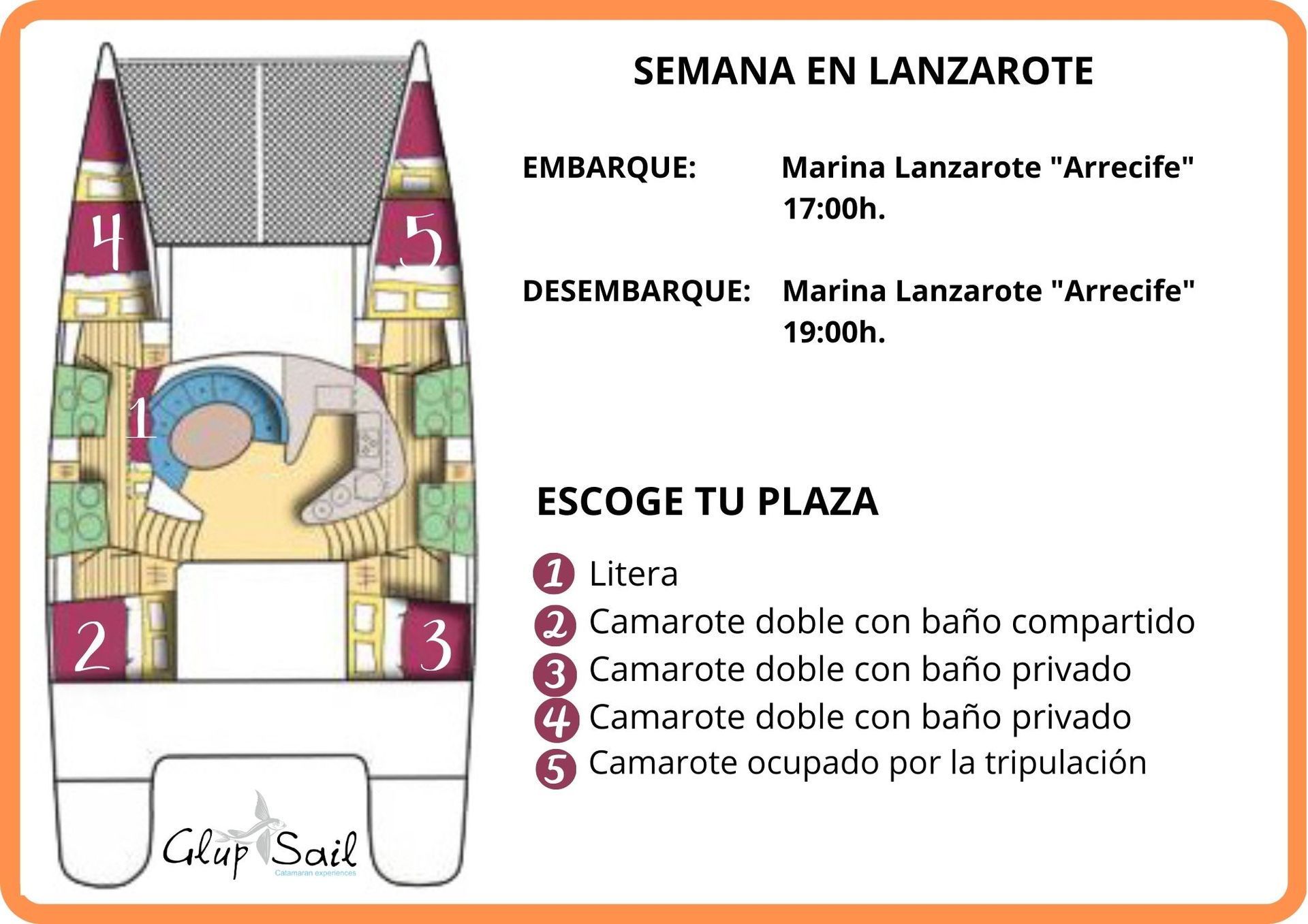 Si has decidido quedarte la noche de cortesía en el barco, abandonaremos el catamarán antes de las 09:00h.